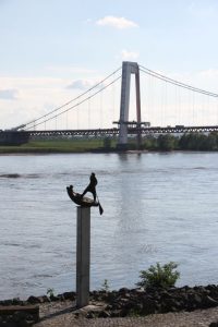 Wir umrunden die St. Martinikirche und gondeln dann auf der offenbar erst vor Kurzem neu gestalteten Promenade am Wasser entlang. Viel zu gucken: die Rheinbrücke Emmerich (mit 803 m die längste