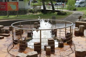 Seitdem sprudelt der „Brubbel“ Link1 / Link2 recht verlässlich alle 35 bis 40 Minuten in die Höhe (zwar nicht so hoch wie auf Island, aber dafür eben auch nicht so weit weg). Man zahlt am Kiosk (Familienbetrieb) einen geringen Eintritt (1,50 Euro pro Person) und ist dann ganz nah dran am Geschehen. Die Wartezeit kann man mit dem Lesen der Erklärtafeln überbrücken oder schon mal die günstigste Position zum Fotografieren suchen (um das Sprudelloch ist eine kleine Arena gebaut worden). Wenn sich die erwartungsvollen Touristen rund herum auf die kleinen Steinsäulen verteilen und andächtig auf das Loch starren, ist das manchmal schon ein Bild für die Götter (*Oh, heiliger Geysir – zeige dich…). Wir machen das Spektakel dreimal hintereinander mit, weil’s so schön ist. Zwischendurch ist noch ein kurzer Gang durch den Ort drin, der unter anderem mit einem kleinen Shop (regionale Produkte) und einer stillgelegten  alten Zapfsäule im Retro-Shabby-Look aufwartet.