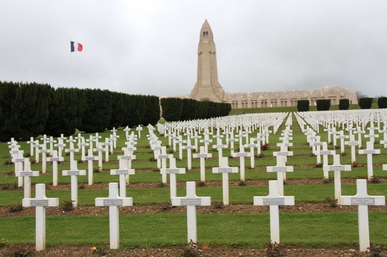 Dieser Tag beginnt etwas besser, obwohl es weiter regnerisch ist. Daher steuern wir Verdun an, nicht die Stadt, aber das Beinhaus „Ossuaire de Douaumont“ mit den riesigen Gräberfeldern davor zu besuchen, ist Pflicht, finden wir! Ebenso wie ein Besuch bei einem der verschwundenen Dörfer.
