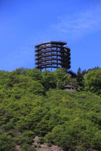 Der Turm selbst ist 42 Meter hoch, und der Blick reicht in das Tal der Saarschleife und auf die grünen Hügel des Naturparks Saar-Hunsrück, bei gutem Wetter sogar bis zu den Vogesen. „Ortsschilder“ am Geländer helfen beim Orientieren in der Landschaft.