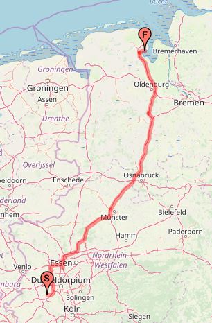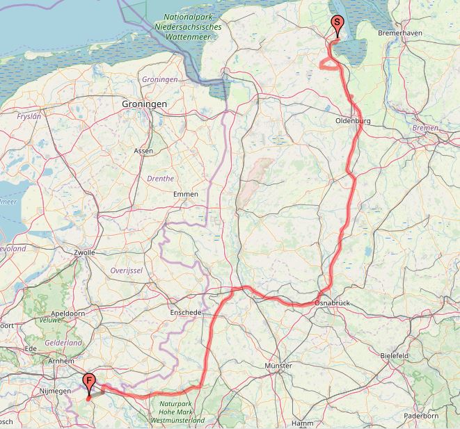 Zu Beginn heißt es Strecke machen. Über die A29, A1 und A31 steuern wir Richtung Emmerich am Rhein. Als Stellplatz haben wir uns den Parkplatz nahe der Rheinpromenade (Kleiner Wall) ausgeguckt. Etwa fünf Wohnmobile können dort am hinteren Rand
