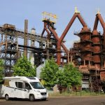 Heutiges Hauptziel – auf der Rückroute Richtung Norden – ist die Völklinger Hütte. Das ehemalige Eisenwerk  wurde 1986 stillgelegt. 1994 erhob die UNESCO die Roheisenerzeugung der Völklinger Hütte als Industriedenkmal in den Rang eines Weltkulturerbes der Menschheit. Das wollen wir uns näher ansehen. Dazu müssen wir wieder ins Saarland. Knapp dreieinhalb Stunden später sind wir da. Auf dem riesigen Parkplatz gibt es sogar gratis Wohnmobil-Stellplätze – in Gittergehegen (fehlt nur noch das Schild „Bitte nicht füttern! 🙂 ). Per Münzeinwurf gibt es Strom dazu. In einem Extra-Gebäude kann man Wasser zapfen (ein Euro für fünf Minuten) oder (auf der anderen Seite der Säule) den Fäkalientank entleeren und spülen.