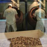 Im Reiseführer haben wir außerdem gelesen, dass die Produktion besichtigt werden kann. Wir fragen im Laden nach und werden einmal ganz außen herum um die Fabrik geschickt, während man uns für die Gratis-Führung per Audio-Guide (auf Deutsch) anmeldet. Am Eingang zur Schau-Produktionsstrecke empfängt uns schon eine nette Dame, die uns mit Kopfhörern, Guide und Bedien-Instruktionen ausstattet. Es gibt Bildschirme, auf denen Erklärfilmchen laufen. Den Ton dazu hört man über die Kopfhörer. Alles schön anschaulich und appetitanregend. Und in den „Schaukästen“ links und rechts des Ganges wird auch tatsächlich gearbeitet. Wir sehen: Da ist noch richtig viel Handarbeit dabei! Zwischendurch öffnet sich die eine oder andere Tür, und es strömt ein verführerischer Kakaogeruch heraus. Mmmmmh!