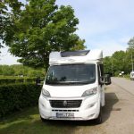 Um kurz nach 20.30 Uhr kommen wir auf dem offiziellen Stellplatz Allee de la Plage direkt an der Mosel an. Gleich nebenan gibt es auch einen  Campingplatz, aber wir bevorzugen ja das freie bzw. Stellplatz-Stehen. Nachdem wir all unser Schul-Französisch zusammengekratzt haben (später entdecken wir, dass es auch eine Deutsch-Taste gibt), entlocken wir dem Parkautomaten die Info, dass von 19 Uhr bis 9 Uhr morgens das Parken frei ist und es dann wohl ein spezielles Halbtages- bzw. Tagesticket zum Sonderpreis von zwei bzw. vier Euro gibt. Das allerdings – so reimen wir es uns mit Hilfe einer netten Womo-Alleinfahrerin aus Bremen, die (samt ihrer beiden Hunde) auch gerade angekommen ist, zusammen – kann man erst morgens ab 9 Uhr aufrufen und zahlen. Wir quatschen noch eine ganze Weile und tauschen Womo-Erfahrungen aus, bis es richtig dunkel ist.