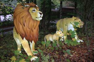 Jetzt packen wir aber doch mal den Lageplan aus, den wir an der Kasse bekommen – mitsamt eines Faltblattes, in dem die Fütterungs- und Erklärzeiten aufgeführt sind. Davon gibt es eine ganze Menge. Da wir keine besonderen Vorlieben haben, gehen wir ab jetzt den nummerierten Pfaden nach und nehmen die Fütterungen, wie sie kommen. Dabei begegnen wir immer wieder auch einigen tierischen Leuchtfiguren, die eigentlich erst abends erst – im Rahmen der „Zoo-Lights“ – leuchten sollen. Aber (wieder) die Löwen tanzen etwas aus der Reihe.