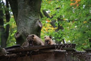 Zunächst stoppt uns aber ein kleiner „Baumwipfelpfad“ über unseren Köpfen, der offenbar nicht für Menschen gedacht ist. Drei niedliche Augenpaare auf einer Baum-Plattform bestätigen unseren Verdacht: Hier tanzen die Nasenbären den Besuchern auf den Köpfen herum – allerdings nicht bei diesem Wetter. Da kuschelt man sich besser zusammen und reckt nur ab und zu die namensgebende Schnuppernase in die Luft.