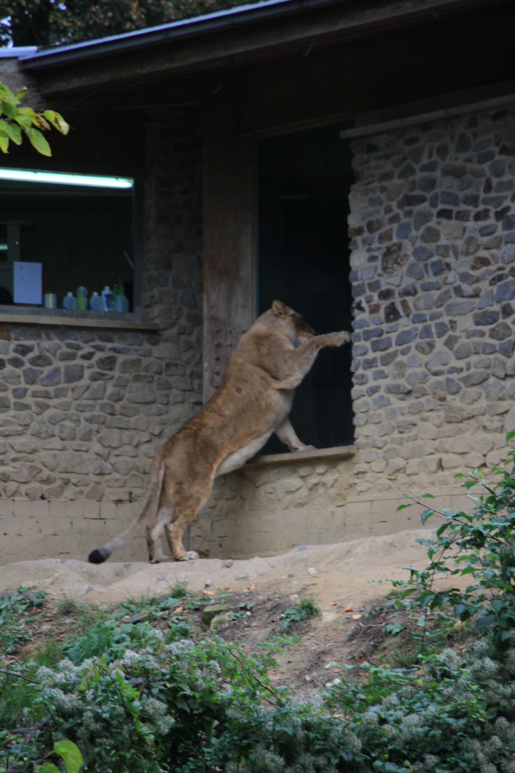 Irgendwann müssen wir uns aber dann doch losreißen. Unser Zoobesuch hat ja schließlich erst angefangen. Vorbei an der Insel der Klammeraffen geht es zunächst einmal den Ohren  nach. Da brüllen doch die Löwen? Tasächlich scheinen die gerade auf ihr Futter zu warten. Eine Löwin „klopft“ schon am Schieber an… Die anderen tigern (hmm…) auch schon etwas unruhig umher. Aber die Zubereitung in der Futterküche hinter dem Freigelände dauert wohl noch eine Weile. Deshalb stromern wir weiter. Erneut nach Gehör.