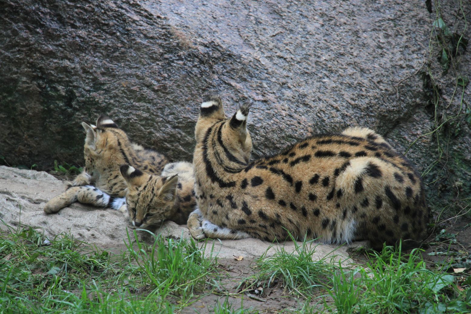 Dösende Servale vor der Fütterung