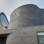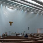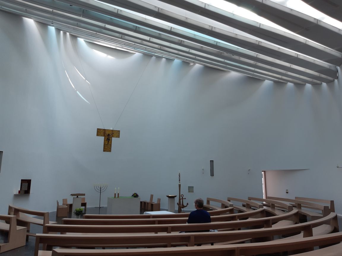 Da schon Sonntagnachmittag (also kein Gottesdienst mehr zu erwarten) ist, stellen wir uns einfach quer auf den kleinen Kirchparkplatz und umrunden die geklinkerte Riesenwelle zu Fuß. Danach geht’s hinein. Innen drin ist es hell und schlicht-maritim. Die Kirchenfenster schweben übrigens über den Köpfen der Besucher. Und da St. Marien (wie der katholische Kirchenbau namentlich getauft ist) Teil des Wangerländischen Pilgerweges ist, schnappen wir uns einen der ausliegenden Pässe und stempeln das erste Siegel hinein.