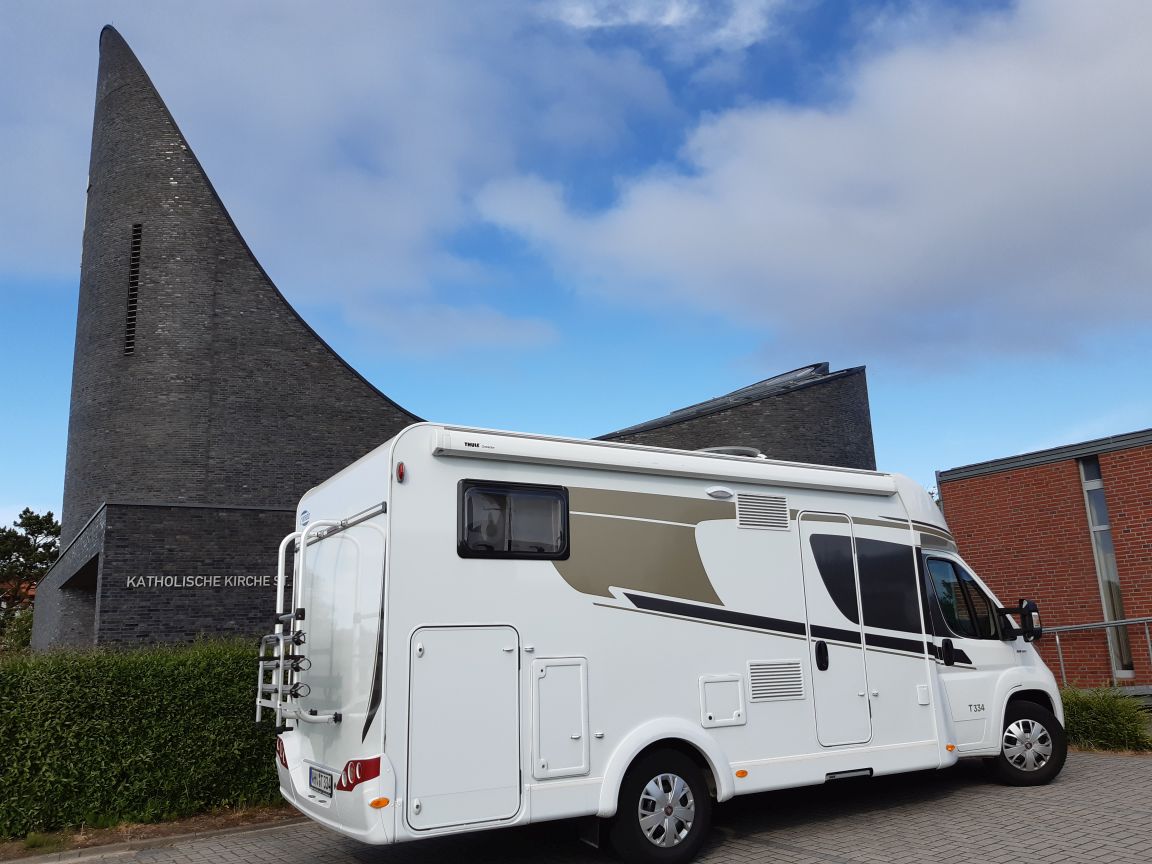 Die Sonne scheint, und unser T-Rex scharrt mit den Hufen. Da wollen wir mal nicht so sein. Also hinein ins Womo und auf zu einem Tagesausflug an die wangerländische Küste. Erste Station: Schillig. Schließlich wollten wir uns die futuristische Strandkirche dort (gebaut 2011-12) schon längst mal angucken.