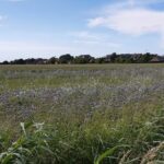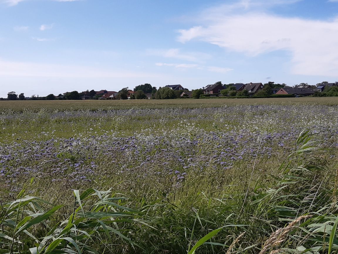 Draußen bewundern wir noch ausgiebig die große ‚blaublütige‘ Blumenwiese auf der anderen Straßenseite. Dann reißen wir uns los und kurven durch weite Landschaft einerseits und puppenstuben-kleine Ortsdurchfahrten zum nächsten Pilgerort. Allerdings finden wir die Türen der evangelischen Kirche St. Severinus und Jacobus (errichtet Anfang des 13. Jahrhunderts) in Minsen schon verschlossen. Schade. Sie soll schöne Wandmalereien haben. Und an den Pilgerstempel kommen wir so auch nicht. Aber der Spaziergang drumherum ist auch schön.