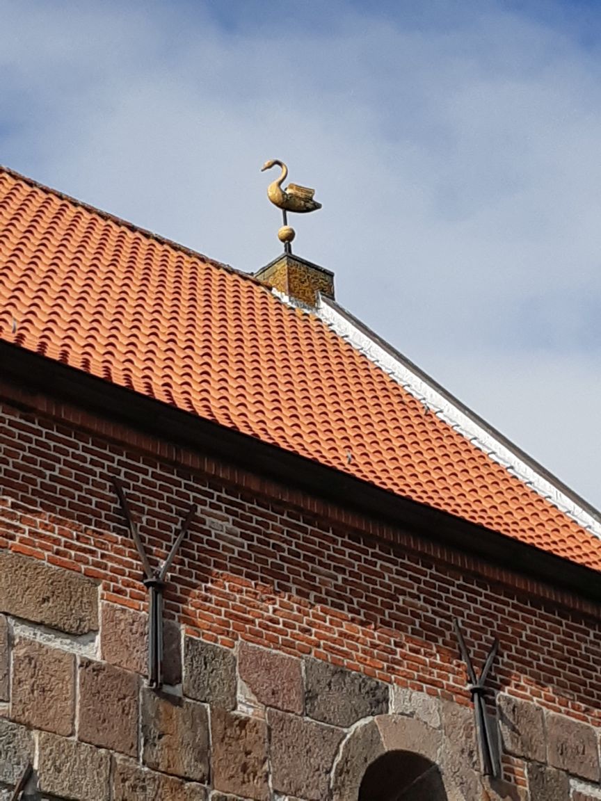 Und dazu glänzt der goldene Luther-Schwan in der Sonne wie frisch gewienert. Kurzer Ausflug in die Geschichte der Kirrchensymbolik: Der Schwan auf dem Dach ist typisch für Ostfriesland. Weil einige Maler Martin Luther mit einem Schwan zu Füßen porträtiert haben (in Anspielung auf ein Zitat des Prager Reformators Jan Hus auf dem Scheiterhaufen: „Heute bratet ihr eine Gans, aber aus der Asche wird ein Schwan auferstehen“/Hus heißt Gans auf Tschhechisch) und sich die lutherischen Gemeinden sichtbar von den ev.-reformierten und katholischen Gemeinden abheben wollten, wurde anstelle eines Hahns der Schwan gewählt.