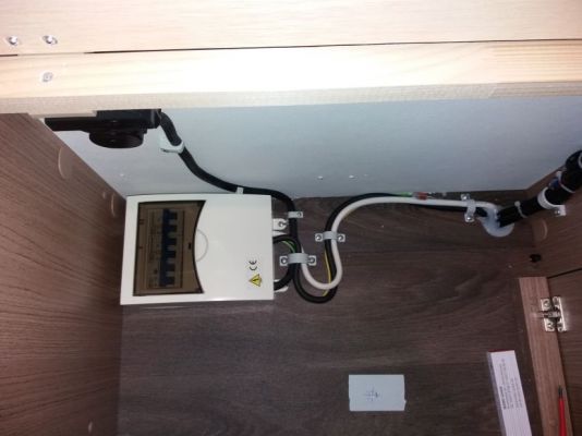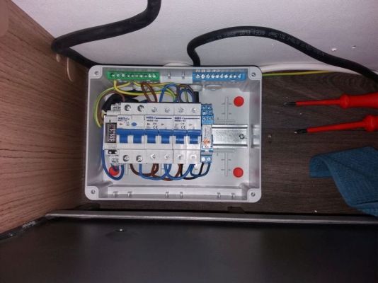 Jetzt ist dort ein Verteiler mit mehr Platz verbaut. Vor die Sicherungen habe ich (das Technik Spielkind lässt Grüßen) noch einen Zähler verbaut, dann den alten original Block mit FI und zwei je 2-pol. Sicherungen, danach folgt ein Relais, das mit der Landstomversorgung anzieht