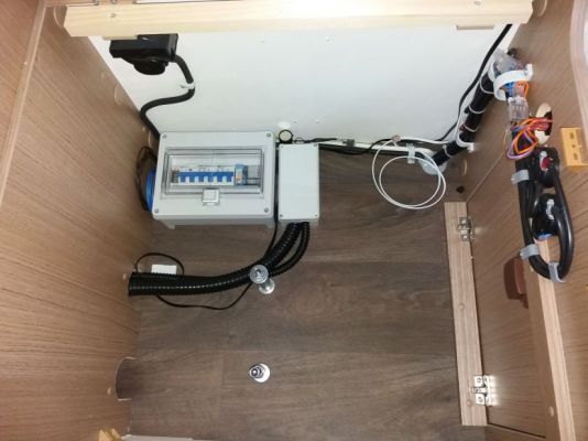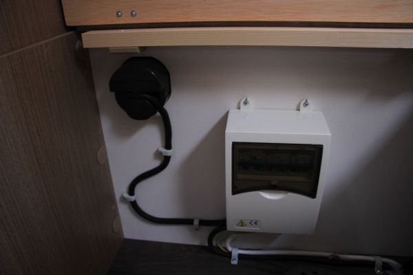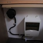 Im Stauraum unter dem 5. Sitz ist der 220 Volt Verteilerkasten sowie einige Kabel, zu einem Kabelbaum zusammengefasst, die zu den Schaltern für die Trittstufe, das Außenlicht und das „Grundlicht“ der Eingangsbeleuchtung führen.