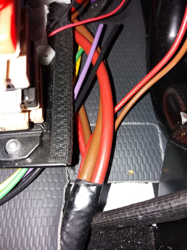 Diese 3 Leitungspaare kommen wohl direkt von der Starter-Batterie, als 6-er Isolierband-Bündel vorne rechts unter dem Fahrersitz an. Mit dabei sind: