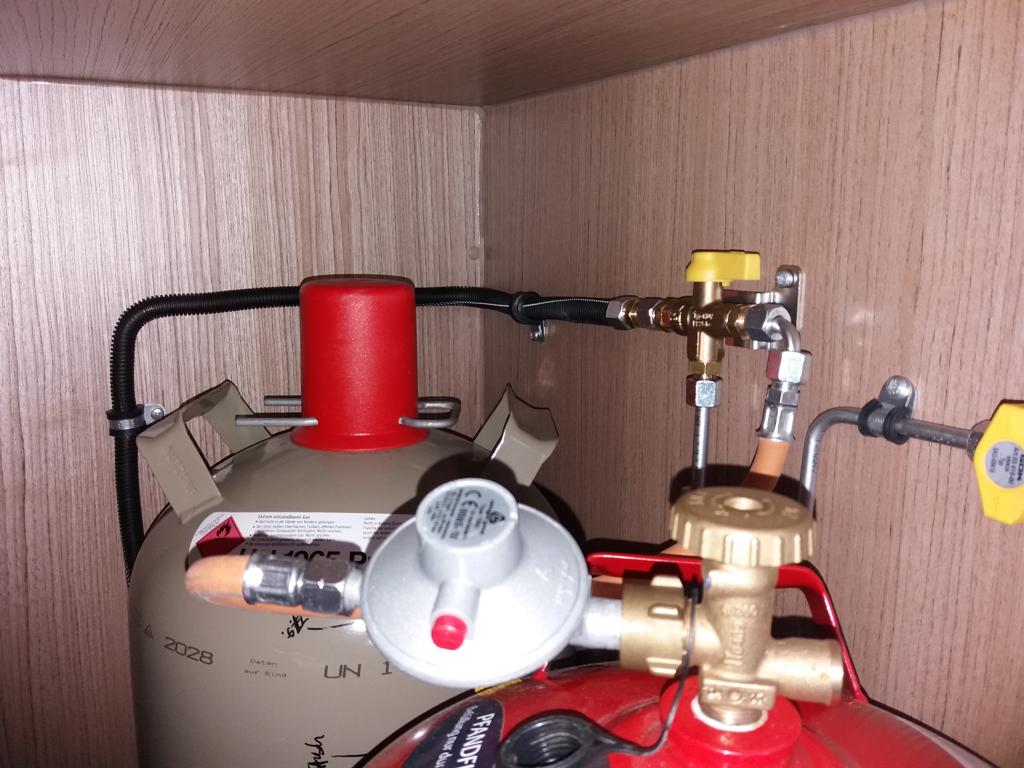 Da ein Liter Flüssiggas ein Gewicht von 510 Gramm hat, beinhaltet eine 11 KG Flasche also gut 22 Liter Gas. Bei 2 Flaschen hat man (bei vollen Flaschen) 44 Liter Gas an Bord. Mit unseren 48 L haben wir also gut zwei „prall gefüllte“ Flaschen dabei und könn(t)en noch zusätzlich 2 Flaschen mitnehmen…